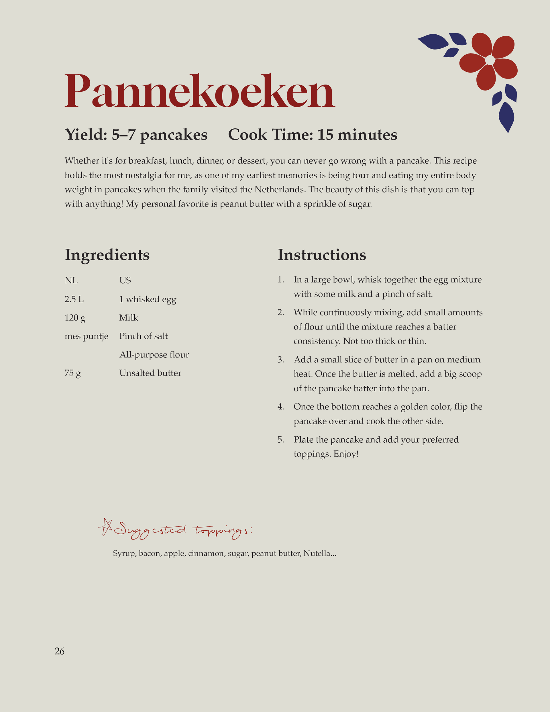 Watching her preserve these traditions has inspired me to preserve them in my own way, through design. My intention with this project is to create a thoughtfully crafted cookbook that organizes recipes in an easy-to-follow format while capturing the character and flair of Dutch culture.